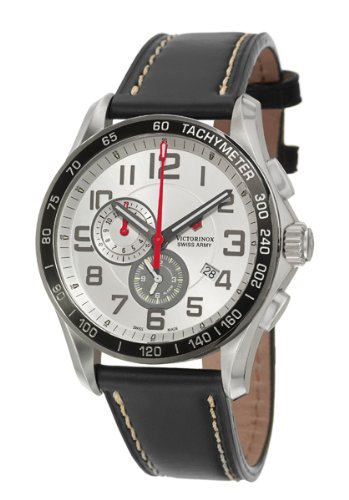The Swiss Army Men's Classic Alarm Chronograph Silver Dial Watch offers a bold, circular dial with gray Arabic numeral hour indexes, a handy minute track around the outer perimeter, luminous hour and minute hands outlined in dark gray, and a dashing red seconds hand. One subdial features minute, hour, and seconds chronograph functions while the second subdial offers a handy alarm function. The gray ion-plated, stainless steel bezel frames the handsome dial and is inscribed with a tachymeter while the stainless steel case provides durability. Made from anti-reflective, sapphire crystal, the window offers strength and excellent protection from daily nicks and scratches. The elegant, black watch strap is made from soft and supple calfskin so you can wear the timepiece comfortably all day. Plus, this watch is equipped with precise Swiss quartz movement and water resistant to 330 feet (100 meters). ...Read more
